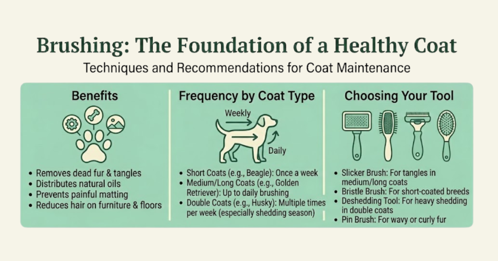 Brushing your dog regularly is just as important as bathing. It removes dead fur, distributes natural oils throughout the coat, prevents painful matting, and significantly reduces the amount of hair that ends up on your furniture and floors.