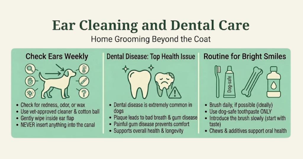 Ears and teeth are two areas that often get overlooked during home grooming routines. Yet, both are critical for your dog’s long-term health.