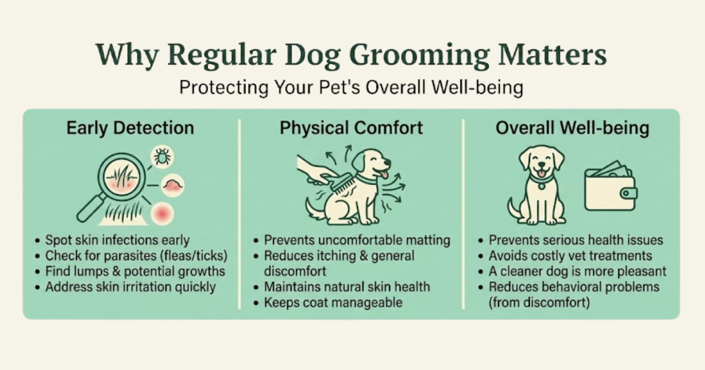 Many dog owners underestimate how much grooming affects their pet’s overall well-being. Beyond appearances, proper grooming helps you catch early signs of skin infections, parasites, lumps, or irritation before they become serious problems. So, making grooming a consistent habit pays off in the long run for both your dog’s health and your wallet.