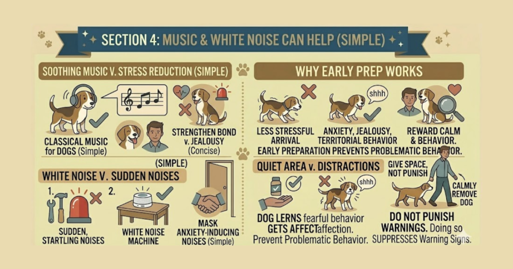 Soothing sounds mask anxiety-inducing noises like construction or fireworks. Classical music, specifically compositions designed for dogs, has been shown to reduce stress indicators. White noise machines create consistent background sound that drowns out sudden, startling noises.