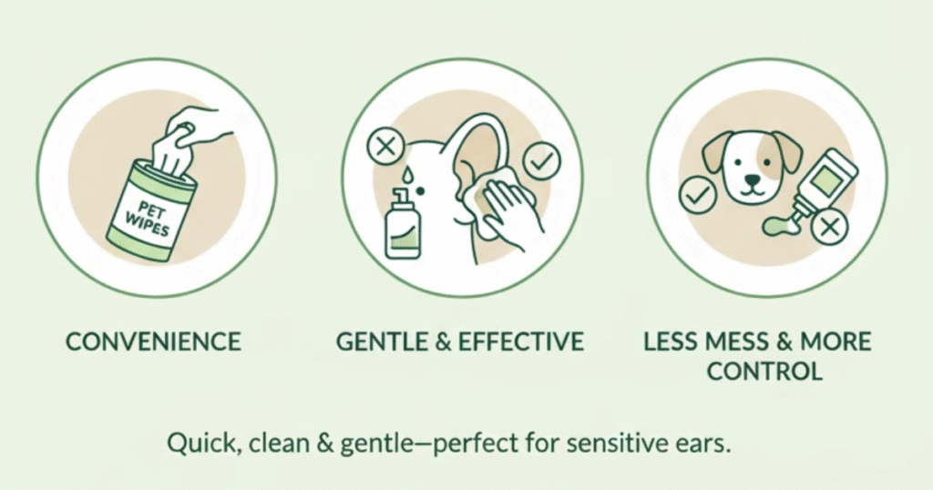 Pet wipes offer several advantages over traditional ear cleaning solutions: