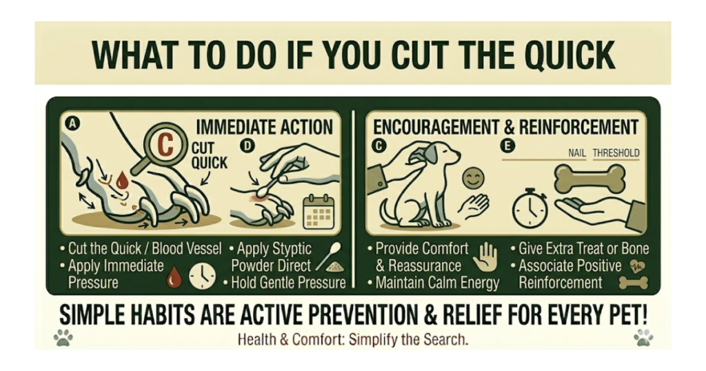 Even experienced dog owners cut the quick occasionally. Stay calm — your dog will pick up on your energy. Apply styptic powder directly to the nail tip and hold gentle pressure for a few seconds. The bleeding typically stops within a minute or two.
