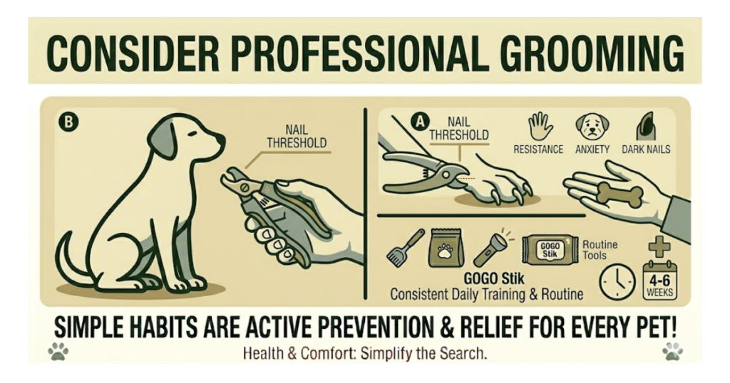 Some dogs truly resist home nail trims despite your best efforts. In those cases, a professional groomer or vet tech can handle it safely and quickly. This is especially useful for dogs with very dark nails where the quick is hard to see, dogs with past negative experiences, or large or strong breeds that are difficult to restrain alone.