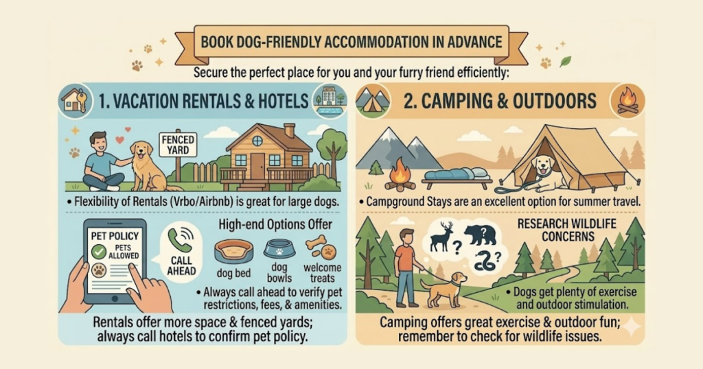 Finding the right place to stay is one of the most important parts of traveling with a dog. Vacation rentals through platforms like Vrbo or Airbnb often offer more flexibility than hotels, especially if your dog is on the larger side. Look for properties with a fenced yard or easy access to green space.