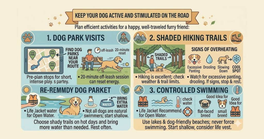 Dogs can get restless during long periods of travel, so it helps to plan activities that give them a chance to run, sniff, and play. Look up dog parks near your route and destination before you leave. Even a 20-minute off-leash session can reset your dog’s energy level significantly, making the rest of the day smoother for both of you.