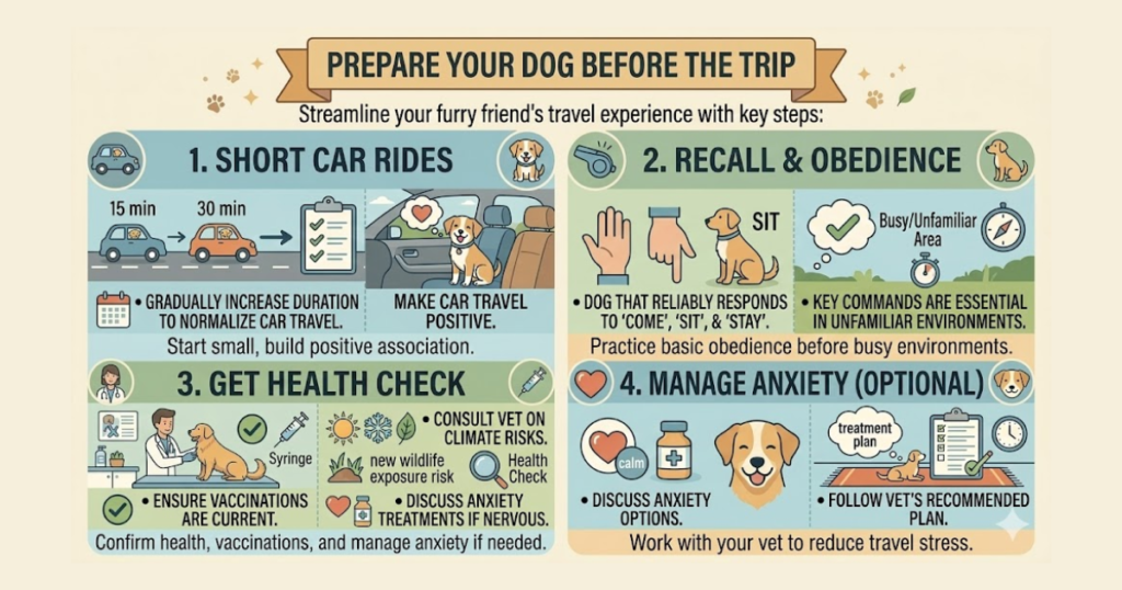 Practice basic obedience commands before the trip too. A dog that reliably responds to “come,” “sit,” and “stay” is significantly easier to manage in busy or unfamiliar environments. If recall is inconsistent, invest a few weeks in training before travel season starts.