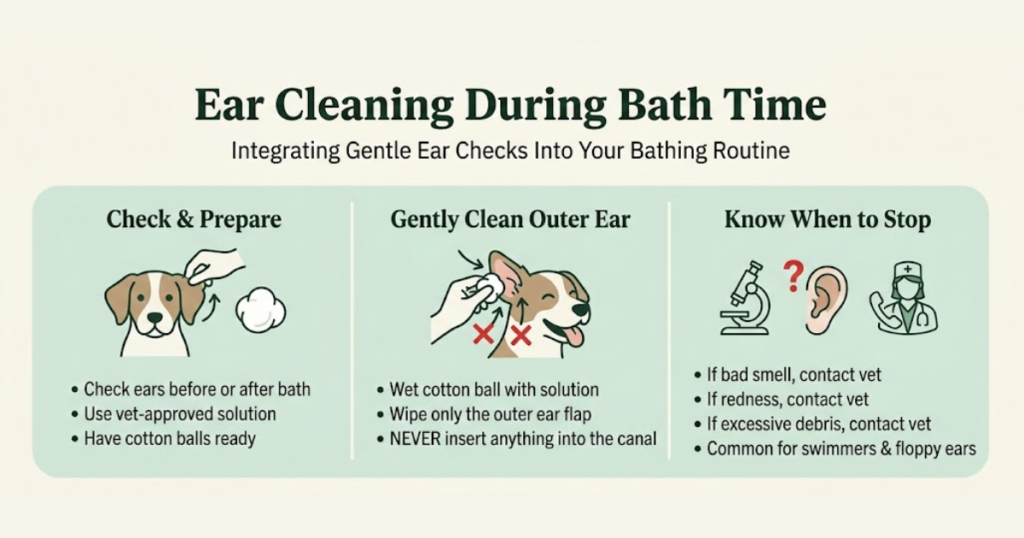 Bath time is a good opportunity to check your dog’s ears, but water should never enter the ear canal. To clean ears safely, use a vet-approved ear cleaning solution and cotton balls. Gently wipe the outer part of the ear — do not insert anything into the canal. If you notice a bad smell, redness, or excessive debris, contact your vet before proceeding.