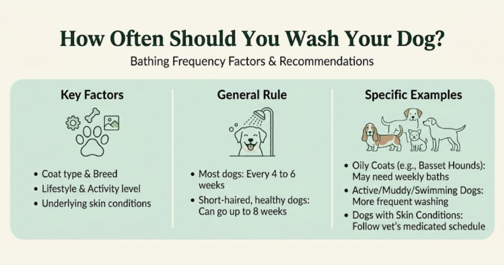 The right bathing frequency depends on your dog’s breed, coat type, and lifestyle. As a general rule, most dogs do well with a bath every four to six weeks. That said, some situations call for more frequent washing: