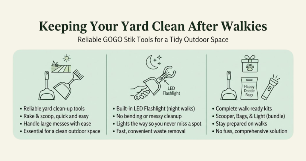 GOGO Stik makes this part easy. The GOGO Stik XP Pooper Scooper Set is a reliable option for everyday yard use, while the EZ Dootie Rake makes quick work of larger messes. For nighttime walks, the GOGO Stik Fido USB Rechargeable LED Flashlight Scooper lights the way so you never miss a spot.
