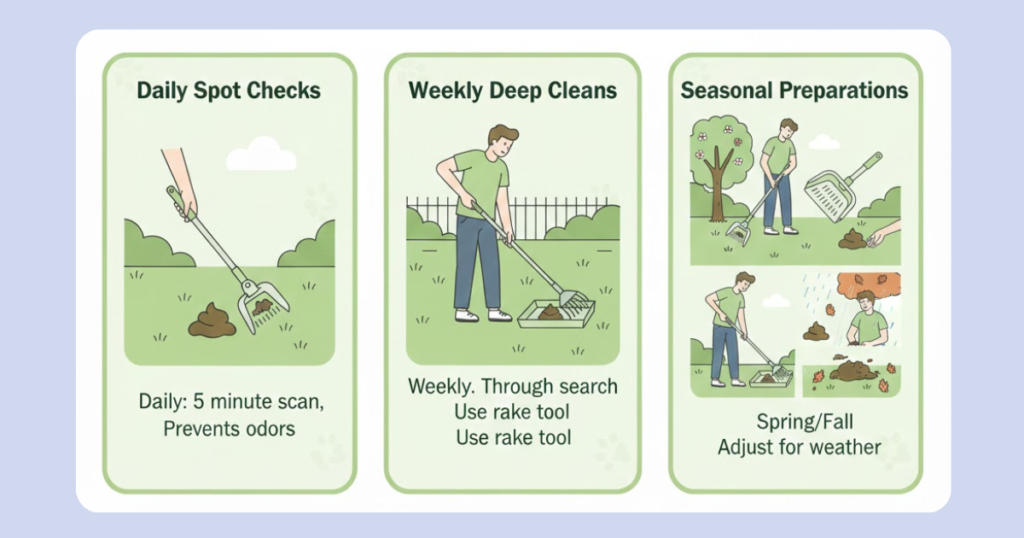 Daily spot checks prevent buildup and keep odors under control. A quick 5-minute scan each evening catches fresh waste before it becomes problematic.