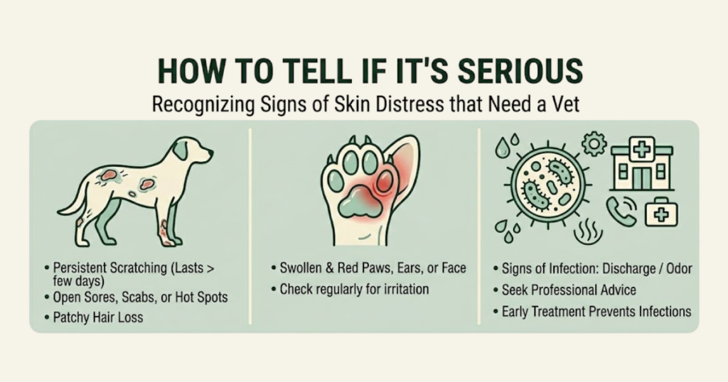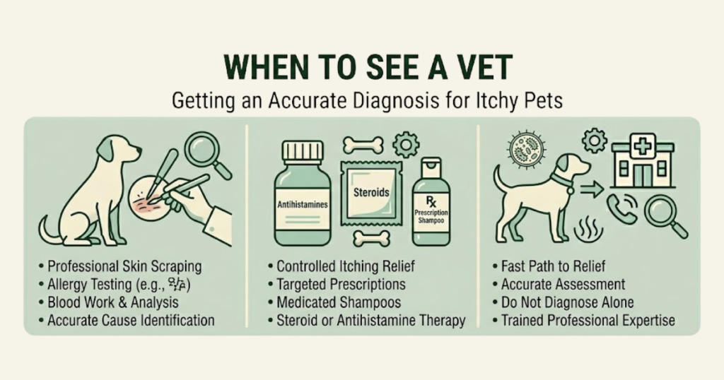 Home care can help with mild cases, but a vet visit is always the right choice if you are unsure about the cause. Your vet can run allergy tests, skin scrapings, or blood work to pinpoint the problem. In some cases, prescription shampoos, steroids, or antihistamines are needed to bring the itching under control.