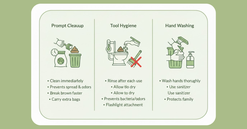 Wash your hands thoroughly after handling pet waste, even when using bags or scoopers. Keep hand sanitizer near your waste storage area for quick cleaning when soap and water aren’t immediately available.