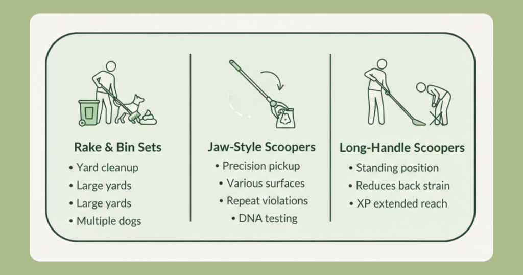Jaw-Style Scoopers: These feature two handles that squeeze together to grip waste. They offer precision pickup on various surfaces. Catch-n-Go hybrid models combine scooping and bagging in one tool.