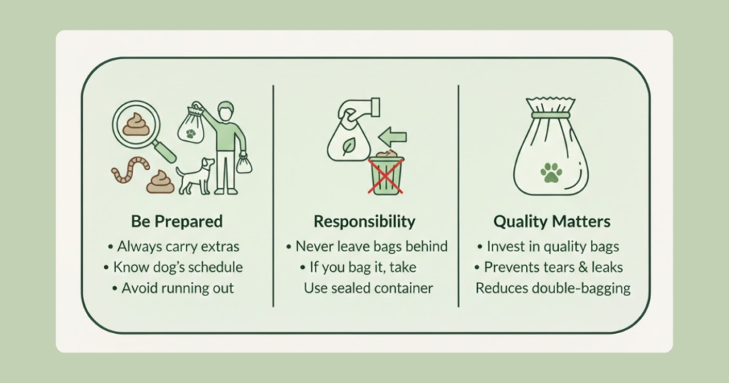Always carry extras. Know your dog’s typical schedule and pack accordingly. Running out of bags mid-walk is no fun for anyone.