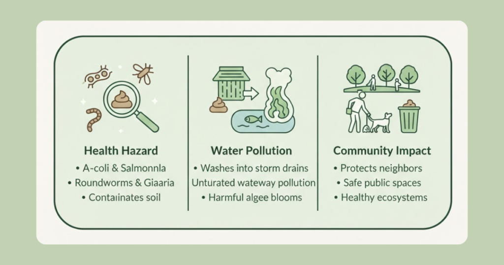 Dog waste isn’t just unpleasant, it’s a genuine health hazard. It contains bacteria like E. coli and Salmonella, along with parasites such as roundworms and Giardia. When left on the ground or improperly disposed of, rain washes these pathogens into storm drains that flow directly into local waterways without treatment.