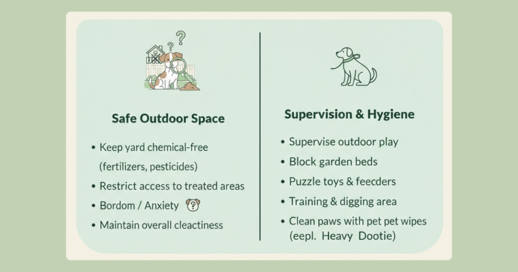 Supervise your dog during outdoor time, especially if they have a dirt-eating habit. Block access to known problem areas like garden beds or potted plants. For persistent diggers and dirt-eaters, creating a designated digging area filled with sand or safe soil can redirect the behavior.