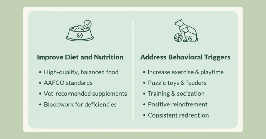 The solution depends on the cause. If nutritional deficiencies are the issue, switch to high-quality dog food and add vet-approved supplements. For behavioral dirt-eating, provide mental stimulation through puzzle toys, increase exercise, and use positive reinforcement training. Always consult your veterinarian before adding supplements or making major dietary changes.