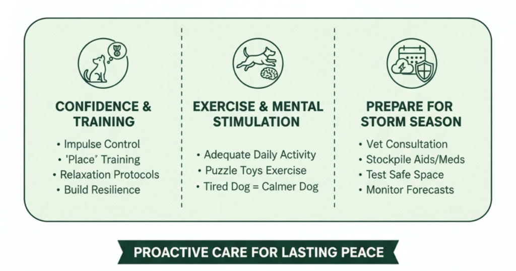 A tired dog is generally a calmer dog. Adequate daily exercise reduces overall anxiety levels and helps your pet handle stress better. Before storm season, increase your dog’s physical activity and add puzzle toys or training games that tire their mind as well as their body.