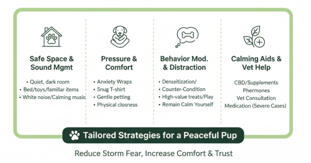 Anxiety Wraps: Commercial products like Thundershirts use maintained pressure similar to swaddling an infant. These snug-fitting garments can significantly reduce anxiety symptoms in many dogs. Put the wrap on before storm symptoms begin for best results.