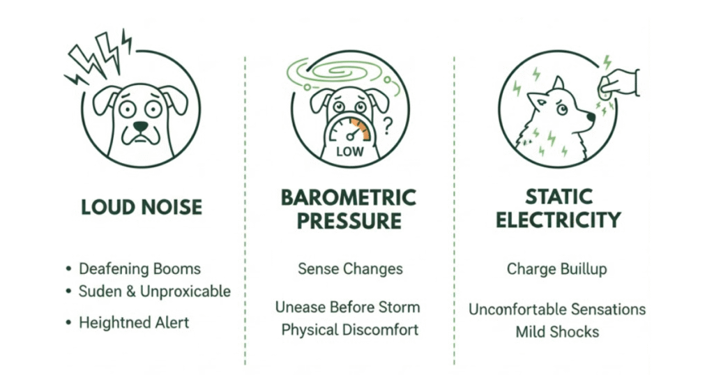 Dogs experience storm anxiety dogs react to for several complex reasons. Their acute hearing allows them to detect thunder from much greater distances than humans can. What sounds like a moderate rumble to us registers as a deafening boom to our pets. The sudden, unpredictable nature of thunder makes it impossible for dogs to anticipate or prepare for the noise, creating a constant state of heightened alert.