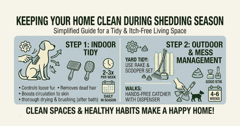 Outdoors is where things can get messier. If your dog spends time in the yard, dealing with both hair and waste becomes part of the routine. Having reliable tools on hand makes the job easier. A pooper scooper and rake set designed for yard cleanup keeps your outdoor space tidy without the hassle. For walks, a catch-and-go hybrid catcher scooper with a built-in bag dispenser makes on-the-go cleanup quick and hands-free.