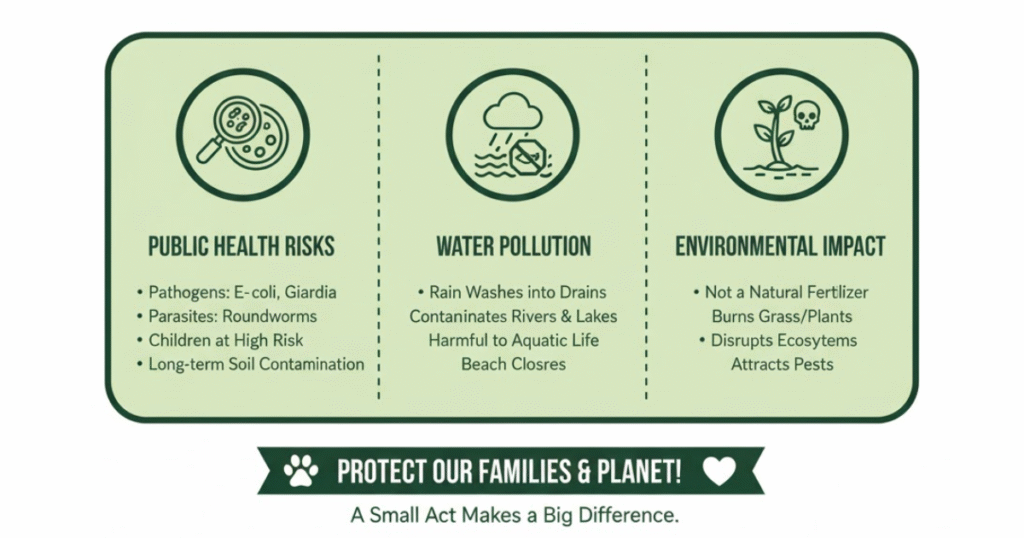 Unpicked dog waste creates multiple serious problems. Health-wise, it harbors harmful bacteria like E. coli and salmonella, plus parasites including roundworms and hookworms that can infect humans and other pets. These pathogens remain viable in the environment for years. Environmentally, rain washes the waste into storm drains, contaminating waterways with excess nitrogen and phosphorus that cause algae blooms and kill fish. You also face legal consequences—most municipalities fine owners $50-$500 for not cleaning up after their pets. Socially, leaving waste damages your reputation, strains neighbor relationships, and makes communities less willing to accommodate dogs in public spaces.