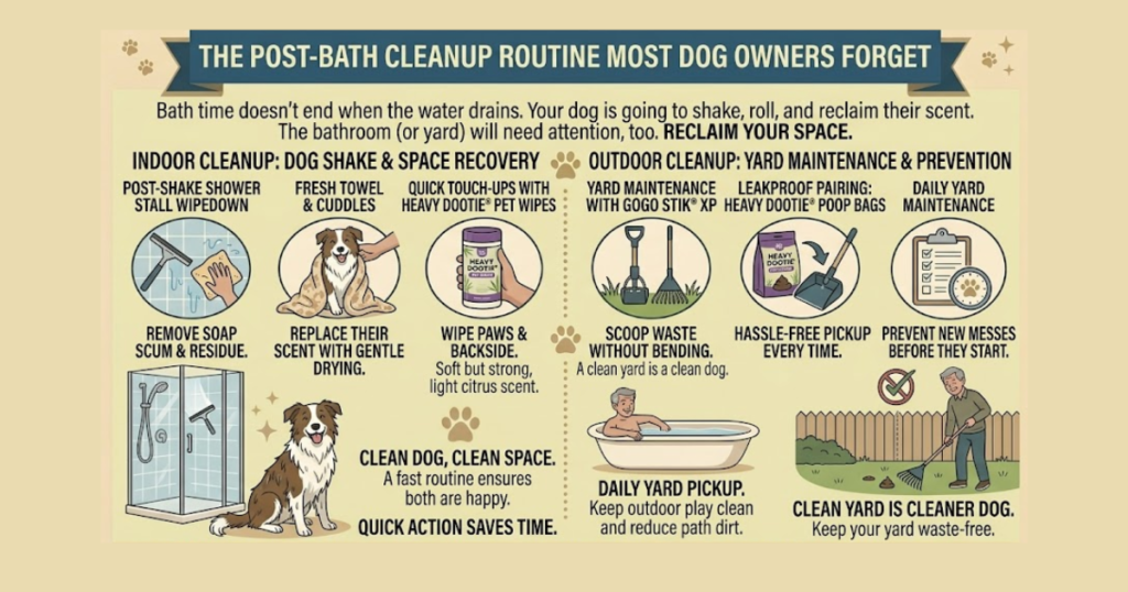 Here’s the thing—bath time doesn’t end when the water drains. After a bath, your dog is going to shake, roll, and do everything possible to dry off and reclaim their scent. That means your bathroom (or yard) will need attention, too.
