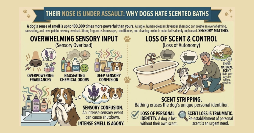 A dog’s sense of smell is up to 100,000 times more powerful than yours. So while that lavender-scented shampoo smells pleasant to you, it can feel overwhelming and even nauseating for your dog. Strong fragrances from soaps, conditioners, and cleaning products create a sensory experience that many dogs find deeply unpleasant. On top of that, baths strip away your dog’s natural scent—the one they’ve spent all week carefully building up by rolling in the grass and rubbing against furniture. To a dog, losing that scent is a big deal.