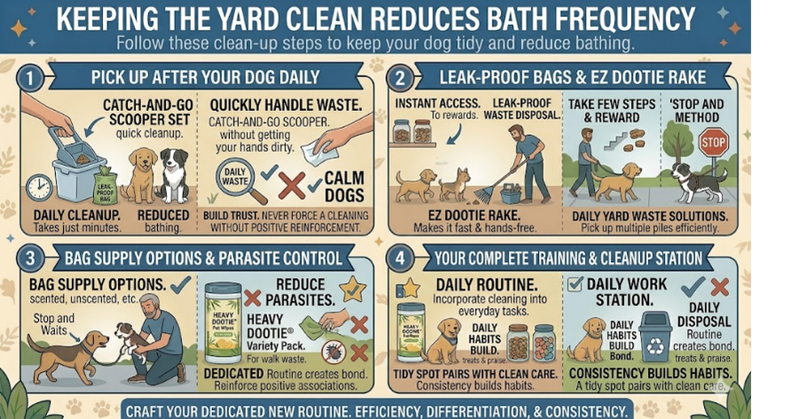 Bath stress often builds up because dogs get dirty frequently, which means more baths. One way to reduce bath frequency is to stay on top of daily dog poop cleanup in your yard. A clean yard means your dog rolls around in less mess, tracks less grime inside, and needs fewer full baths overall.