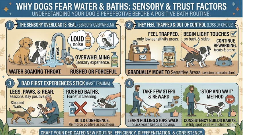 Dogs process the world through their nose and ears far more than we do. During a bath, they’re hit with loud running water, strong-smelling shampoos, and the echo of a bathroom or laundry room. On top of that, the feeling of water soaking through their coat can be uncomfortable, especially for breeds with thick or double coats.