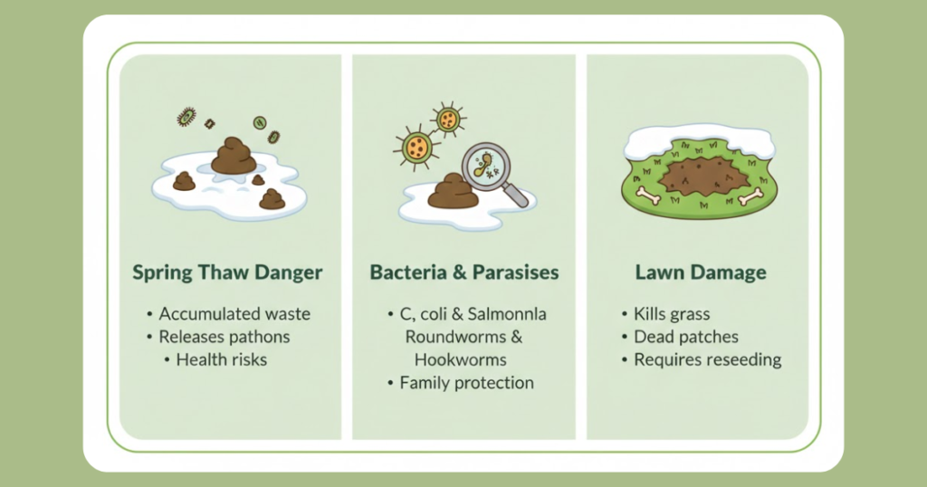 Frozen waste doesn’t decompose. Instead, it accumulates throughout winter, creating breeding grounds for bacteria and parasites. When spring arrives, melting snow reveals months of accumulated waste, releasing harmful pathogens into your yard. Children playing outside and other pets become exposed to these health risks.